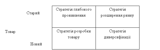 проникнення на ринок, розвитку ринку збуту, розробки нового товару, диверсифікації.