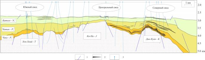 геологический разрез месторождения Белый Тигр: 1 – тектоническое нарушение; 2 –