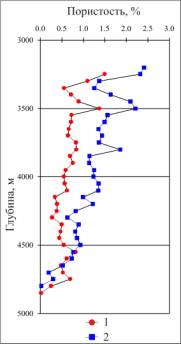 50-метровым интервалам вторичной пористости (Кпвт): 1 – по результатам интерпретации FMI; 2