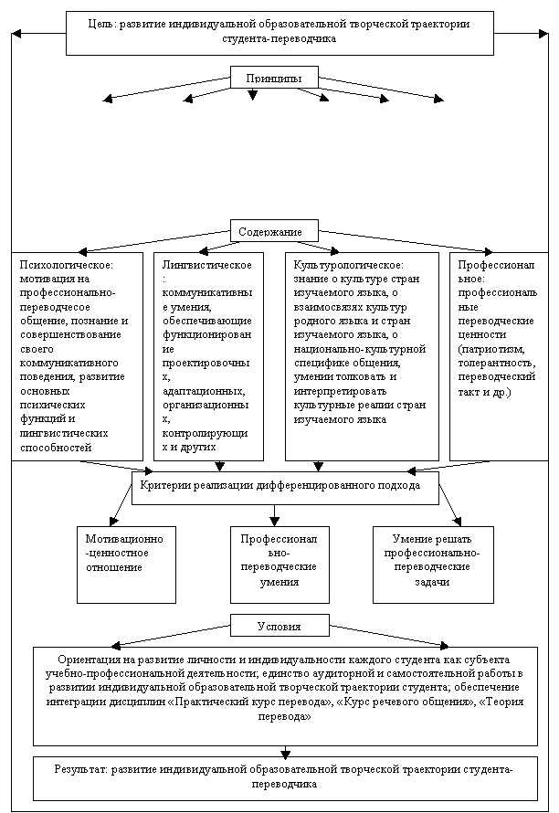 Рассматривая процесс реализации дифференцированного подхода в иноязычном образовании переводчиков, были выделены его следующие    компоненты: цель, принципы, содержание, критерии реализации дифференцированного подхода, условия, обеспечивающие реализацию предложенной модели.