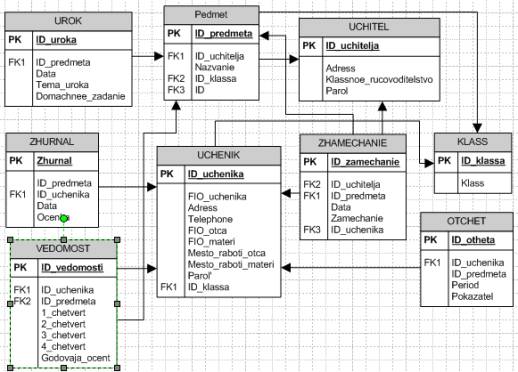 между таблицами Uchitel, Uchenik, Vedomost, Zhurnal, Predmet, Urok, Zamechanija, Raspisanie, Klass, Otchet представлено на рисунке (рис. 2).
