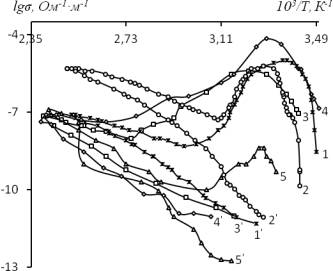 хода температурной зависимости электропроводимости максимумы отсутствуют.