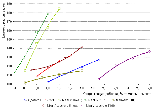 180 мм, а более поздний аналог «Melflux 2651F» обеспечивает такую же текучесть смеси при более