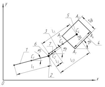 а звено 4 имеет вид прямоугольника с размерами 2ax2b. Массы звеньев mi сосредоточены в центрах их симметрии – точках Сi. Углы наклона звеньев к оси Ох равны φ1,