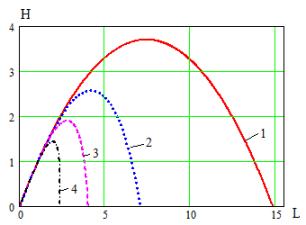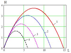 Рис. 3 Высота и длина прыжка робота: а – 1 – v=0, 2 – v=2.5, 3 – v=5, 4 – v=7.5,