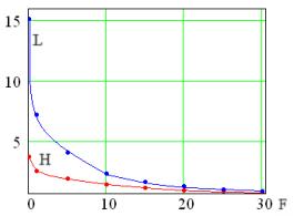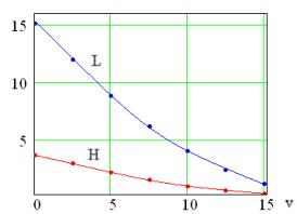 Рис. 4 Зависимости: а – Н(v), L(v), б – Н(F), L(F)