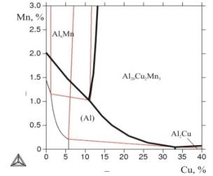 TTAL5) границы ликвидуса для тройной системы Al–Cu–Mn. Из рисунка 1а следует, что с увеличением в