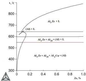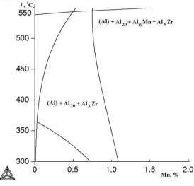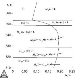 компонентами могут быть иметь следующий фазовый состав: (Al)+Al6Mn+Al3Zr (I);(Al)+Al6Mn+Al20Cu2Mn3+Al3Zr (II):(Al)+Al20Cu2Mn3+Al3Zr (III); (Al) +Al20Cu2Mn3+Al2Cu+Al3Zr (IV). Оптимальной, как это показано в [2], является область III.