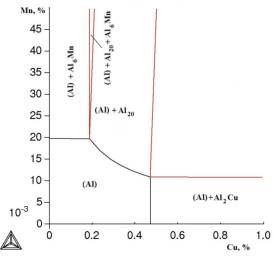 сплаве содержания меди граница появления первичных кристаллов Mn-содержащих фаз (Al20Cu2Mn3 и Al6Mn) сдвигается в сторону меньших концентрации марганца. Этот результат