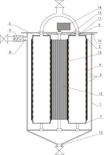 Где 1-цилиндрический корпус, 2-трубчатый каркаса, 3-дренажными отверстия для прохода очищаемой жидкости, 4-полупроницаемые мембраны, 5-съемная крышка мембранного модуля, 6-патрубок для вывода очищенной жидкости, 7-глухое днище, 8-патрубком для ввода очищаемой жидкости, 9-фильтр грубой очистки, 10-патрубок для вывода недоочищенной жидкости, 11- съемная крышка корпуса, 12-эластичный элемент, 13-ребристая поверхность, 14-электродвигателя, 15-устройство для подачи промывной жидкости, 16-патрубок.