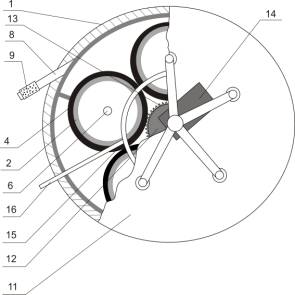 поступает через патрубок 16. Эластичный валиковый элемент 12 с ребристой поверхностью 13, касаясь поверхности мембраны