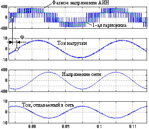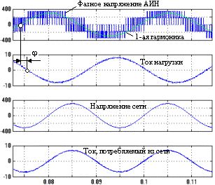 3 приведены осциллограммы токов и напряжений НПУ со стороны нагрузки и сети при