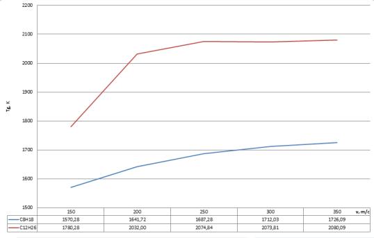 изменение температуры сжигания в камере сгорания при оптимальной скорости 350