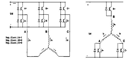 состояние ключей фазы: А(В,С)=1 – включен верхний ключ (А+, В+, С+); А(В,С)=0 –
