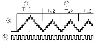 1 – Период циклической работы счетчика 2 – Изменение периода циклической работы счетчика 3 – Код содержимого счетчика 4 – Счетные импульсы |