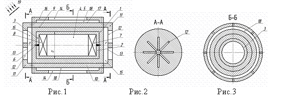 ПГ містить корпус 1 з циліндричною, діаметром D, порожниною 2, яка частково заповнена робочою рідиною 3. В порожнині 2 корпусу 1, розташований поплавковий підвіс 4 з гіромотором 5, який встановлюється на опорах 6 і має датчик кута 7 і датчик моментів 8 для визначення курсу. На зовнішній поверхні 9 корпуса 1 розміщений тепловий кожух 10 з кришками 11, які перфоровані радіальними наскрізними пазами 12 однакової довжини і ширини і з’єднують навколишнє середовище із повітряним проміжком 15 між корпусом і внутрішньою поверхнею 13 кришок теплового кожуха. На зовнішній оболонковій частині теплового кожуха 10, установлений додатково співвісно циліндричний, перфорований наскрізними поздовжніми пазами 14 однакової довжини і ширини, екран 16, відокремлений від зовнішньої поверхні 17 теплового кожуха повітряною порожниною 18.