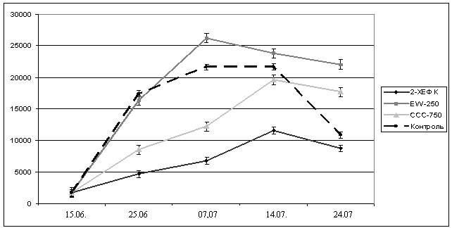 даного показника (37%) спостеріалося під вплтвом 2-ХЕФК, а найменше за дії EW-250 (12%). Етиленпродуцент 2-ХЕФК та