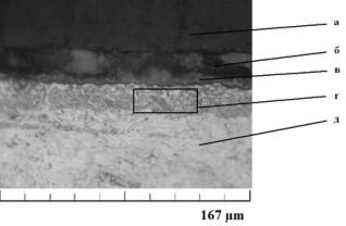 – переходной слой; г – зона структурных изменений; д – основа металла (ширина