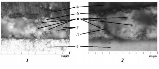 Рис. 3 . Фотографии микрошлифов образцов из титана ВТ16 после ЭПН оксида алюминия (1) и