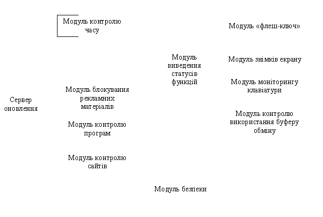 Модуль контролю програм відповідає за заборону доступу до окремих програм. На всі програми, які входять до чорного списку (ігри, миттєвий обмін повідомленнями і т.п.) доступ блокується. Модуль взаємодіє з модулем безпеки. Також відбувається взаємодія з модулем виведення статусів функцій програми для відображення дій адміністратору. Модуль взаємодіє з сервером оновлення списку заборонених програм.