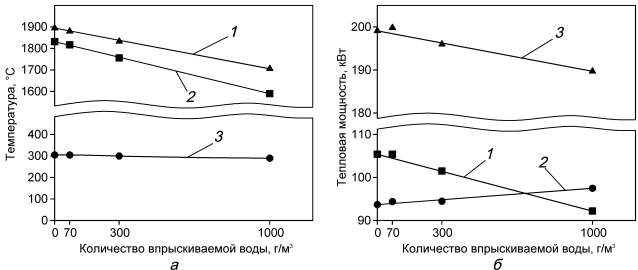 радиационной части от количества впрыскиваемой воды: 1 – калориметрической температуры горения; 2 – теоретической температуры горения; 3 – температуры газов на выходе из радиационной части; б – зависимости количеств теплоты,