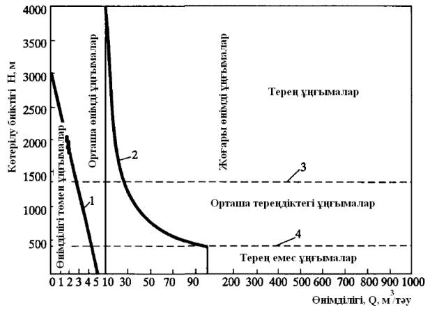 өнімділіктегі ұңғыманың шекарасы; 3 — терең