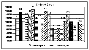 Самые высокие значения содержания Сmic обнаружены в тех же МП, что и в случае с Vbasal. Максимальные значения Сmic достигают 168 мгC/100 г почвы (МП Н7, Барское) в темно-гумусовой маломощной почве. Минимальные же значения Сmic зафиксированы в темно-серой стратифицированной почве (МП Н15, Резников Яр) и в черноземе глинисто-иллювиальном (МП Н18, Воробьево), 30,1 и 20,6 мгC/100г почвы, соответственно. При этом уровень Vbasal на этих МП не был самым низким.