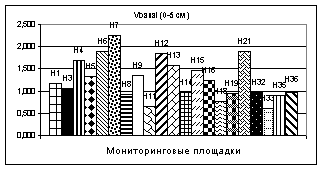 Дыхательная активность почв выражается в довольно широком диапазоне (рис.2): от 0,6 мкгС/г*час (МП Н11 днище балки Суры, МП Н33 Садки) до 2,2 мкгС/г*час (МП Н7 Барское). Самые низкие значения зафиксированы на различных почвах: в стратоземе темногумусовом (днище балки Суры, МП Н11); черноземе глинисто-иллювиальном (Воробьево, МП Н18) и в темногумусовой метаморфизированной почве (Садки, МП Н33). Самые же высокие показатели базального дыхания обнаружены в темногомусовой маломощной почве (МП Н7 Барское) и в черноземе глинисто-иллювиальном (МП Н21 Еремкин лог), т.е. зависимость базального дыхания от типа почвы не прослеживается. Однако прослеживается некоторая зависимость от режима землепользования: на плакоре косимого участка Ямской степи (чернозем миграционно-мицелярный) уровень Vbasal выше, чем на плакоре некосимого участка (та же почва, участки расположены в нескольких метрах друг от друга).