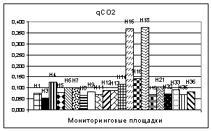 Следует отметить, что в почвах МП Н15 (Резников Яр) и Н18 (Воробьево) наблюдаются самые высокие показатели метаболического коэффициента qCO2: 0,369 и 0, 375, соответственно. Все остальные МП укладываются в диапазон от 0,052 до 0,143. На участках косимой Н12 и некосимой Н13 с черноземом миграционно-мицелярным Ямской степи были зафиксированы практически одинаковые значения qCO2. С точки зрения антропогенного загрязнения, величины qCO2, превышающие величины 0,1-0,2, отражают угнетение и нарушение микробного сообщества (Благодатская и др., 1995).