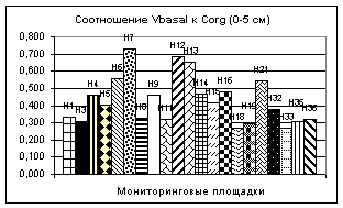Анализ удельной скорости базального дыхания (Vbasal/Сorg, мкгС/г*час), величины, которая может служить косвенной характеристикой устойчивости органического вещества к разложению, показал, что наименьшие значения зафиксированы в МП Воробьево (Н18) – 0,266 мкгС/г*час, и Садки (Н33) – 0,270 мкгС/г*час. Чем ниже значения Vbasal/Сorg, тем менее подвержено органическое вещество этих почв минерализации и соответственно более стабильно (Мостовая и др., в печати). Самые же высокие значения обнаружены в Барском (Н7) – 0,727 мкгС/г*час, и на участках косимой и некосимой степи (Н12, Н13) – 0,684 и 0,651 мкгС/г*час, соответственно. Для целей нашего исследования важно, что низкие значения удельной скорости базального дыхания означают уменьшение легкодоступного субстрата в органическом веществе, которое может быстро разлагаться микроорганизмами, и такие значения косвенно свидетельствуют об угнетенном состоянии микробного сообщества.