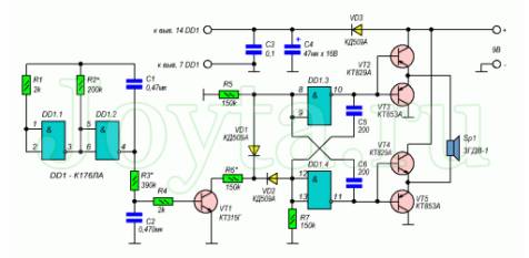 элементах R5, R7, C5, C6, DD1.3 и DD1.4. Его частоту возможно изменять в