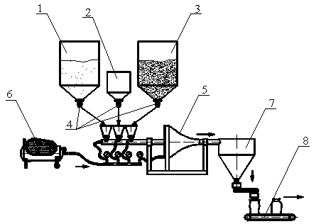 дозаторы, 5 - пневмосмеситель, 6 - компрессор, 7 - фасовочная машина, 8 -