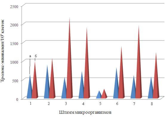 штаммов Lactobacillus fermentum (тролокс-эквивалент на 109 клеток равен 2182), Micrococcus spp. (тролокс-эквивалент на 109 клеток равен 1968) и Lactobacillus plantarum (тролокс-эквивалент на 109
