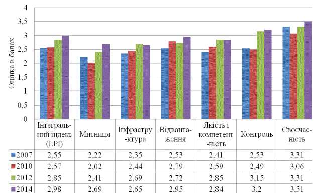 оцінками Світового банку, своєчасність поставок вантажів (3,51), а найменш