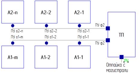 всему участку РЭС с магистрали на текущий момент; ПУ-ф1 и ПУ-ф2 - электросчетчики,