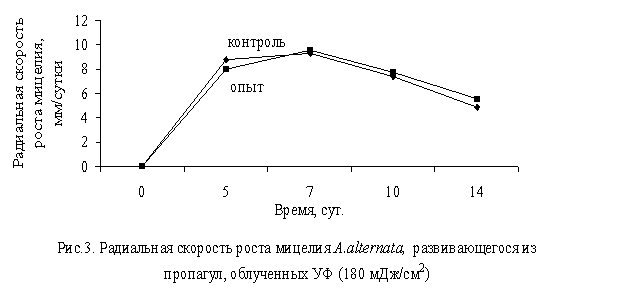 наблюдается существенное отставание радиальной скорости роста мицелия A. аlternata в опыте, при воздействии УФ в дозе 180 мДж/см2 характер роста в контроле и опыте