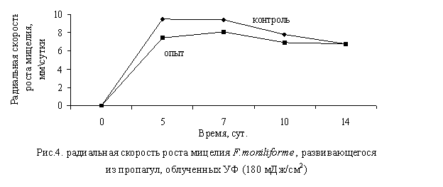 мДж/см2 и УФ в дозе 180 мДж/см2 на радиальную скорость роста мицелия на 5,