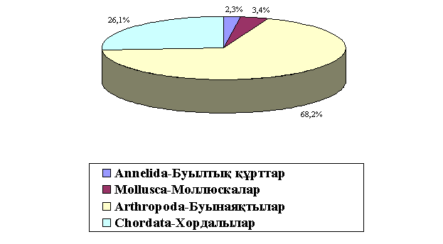 Буынаяқтылар типінің 3 класының 14 отрядынан 60 түрі (68,2%),