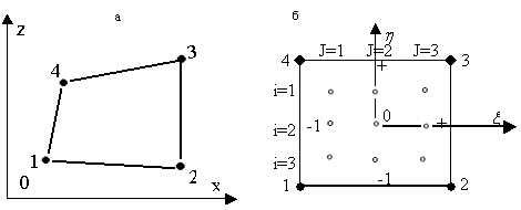 Рисунок 2. Четырехугольный расчетный элемент первого порядка. а
