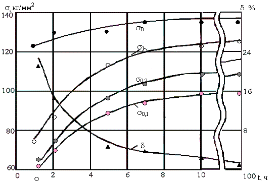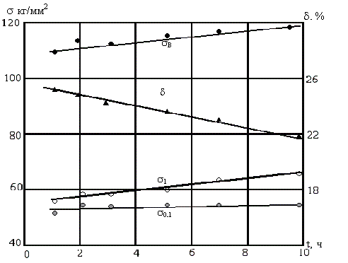 прочностных свойств сплава от продолжительности старения. На рис. 4 приведены