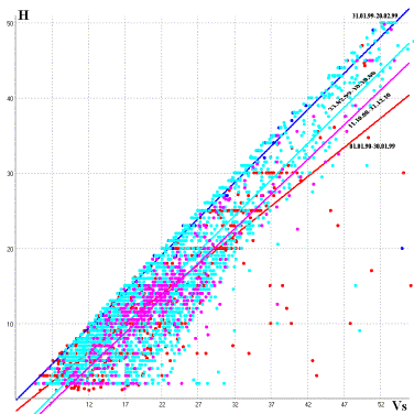 Рис.4. Зависимость скорости V(s-p) от глубины за периоды (01.01.99-30.01.99;