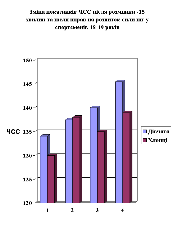 1. Найбільше підвищення ЧСС визивають вправи для розвитку сили ніг (присідання зі штангою вагою 40кг -145,5±5 ударів за хвилину – у дівчат та 139±1 ударів – у хлопців, а також вставання на брусок на носки зі штангою вагою 30кг (140±5 – у дівчат 135±2 ударів за хвилину – у хлопців).