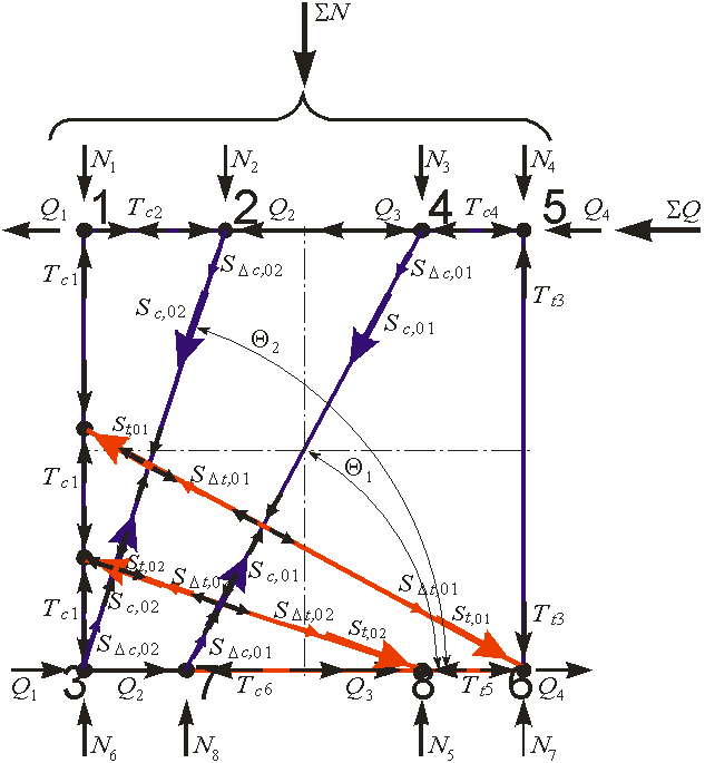 Используем теорию сопротивления сжатых железобетонных элементов с различным углом наклона, под площадкой передачи усилий на сжатый элемент возникают упрочненные зоны клинообразного очертания грани которой наклонены под углом 450. Возникает проблема определения размеров грузовых площадок двух расчетных сжатых армокирпичных полос стен. Предлагается в качестве эквивалентных грузовых площадок использовать ширину наклонных полос по низу и по верху lsup,v и lsup,d, рис. 1. Усилия поперечного растяжения определяются путем замены каждого усилия на два расклинивающих сжимающих усилия Sc,1 Sc,2 наклоненных под углом 450 к поперечной оси каждого сжатого подкоса-полосы. В результате образовалась самостоятельная стержневая модель каждого сжатого подкоса, позволяющая определить усилия поперечных растяжений T1 и Т2. Таким образом, цель достигнута, имеется в виду, что модификации расчетных моделей армированных стен включают в себя самостоятельные стержневые модели, позволяющие определить вышеназванные усилия, которые воспринимает армированная кладка.