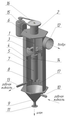 патрубками для подачи рабочей жидкости 10 и отвода шлама 11. На корпусе