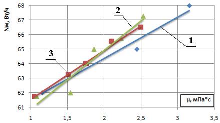 вязкости шлама: 1 – мучная пыль; 2 – подсырная сыворотка; 3 – кормовые дрожжи.
