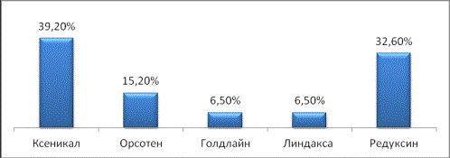 (39,2%), на втором – Редуксин (32,6%), третье место отвели Орсотену (15,2%).