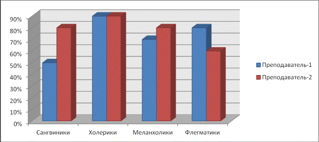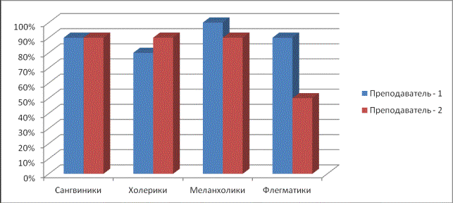 преподавателей. Небольшой разрыв в 10% есть между студентами - холериками, и при этом усвоенного материала ими - 80% у