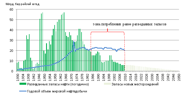 разведанными запасами месторождений нефти на земле и объемом добычи (см. Рис.