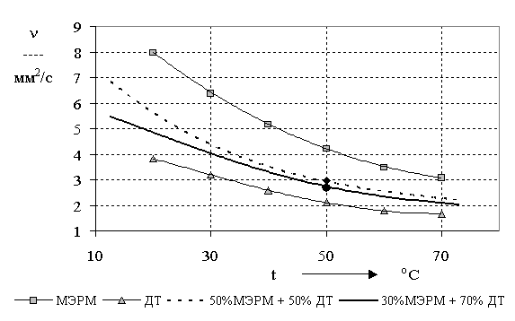 На рис. 1 маркерами відзначені значення в'язкості компонентів сумішей ДТ і МЕРМ отримані експериментально. Товстими лініями відображені результати розрахунку для сумішей при варіації процентного вмісту компонентів. Жирними маркерами відображені експериментальні значення в'язкості сумішей. Помилка в розрахунку становила не більше 2,5%.