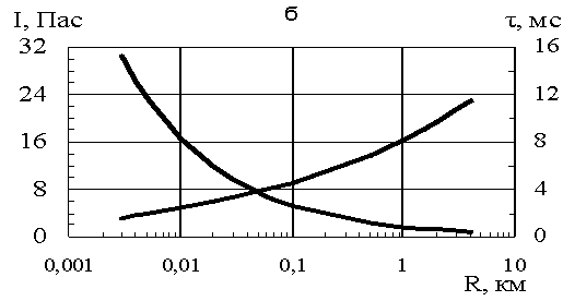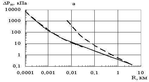 где R в м, ∆Pm в МПа, I в Пас, q = 0,0675 кг/м - удельная масса тротила в кг/м при G = 270 кг и длине заряда L = 4 км. Расчеты давления при цилиндрической симметрии